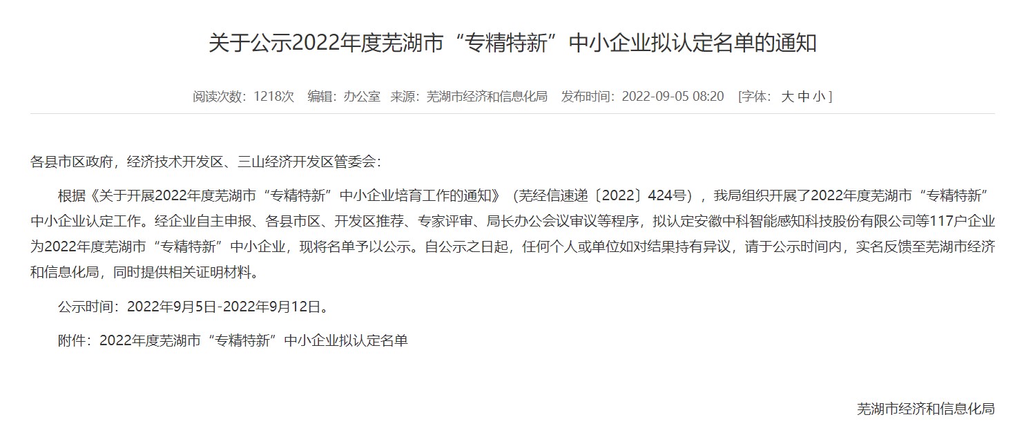 9月5日,芜湖市经信局公布了 2022年度芜湖市“专精特新”中小企业认定名单,经过7天的公示期,安徽多多28信息技术有限公司等117家企业被认定为2022年度芜湖市“专精特新”中小企业。