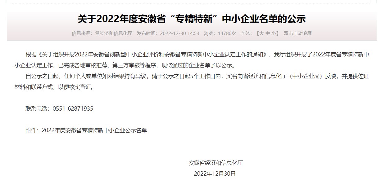 ? ? ? ? ?近日,安徽省经信厅公布了2022年安徽省“专精特新”中小企业名单。安徽多多28成功通过审核,被认定为安徽省“专精特新”中小企业!