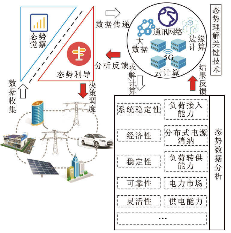 态势理解是数据分析阶段,深入理解与挖掘在态势觉察阶段中收集到的数据,并从系统稳定性、经济性、负载转供能力、可靠性、灵活性、供电能力、负荷接入能力和分布式发电消纳能力等方面分析智能配电网的运行态势,其架构如下图所示。态势理解主要关键技术包括:不确定性潮流计算技术、混合状态估计技术、配网弹性分析与自愈控制技术、配网可靠性与灵活性分析技术、配网协同调度技术、配网故障定位技术、电力市场技术、虚拟电厂技术、边缘计算技术等。