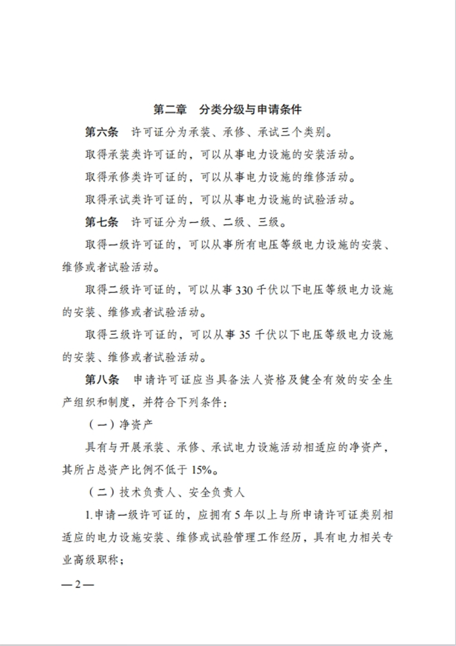 一是完善立法依据,细化许可范围。总则中增加《中华人民共和国能源法》作为立法依据,对承装、承修、承试电力设施的定义进行细化,进一步明确承揽发电项目升压站、外送线路等涉网工程需要取得许可证。