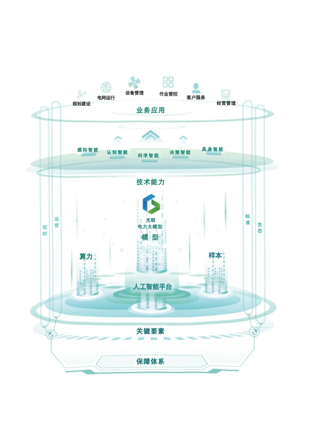 立足企业级战略视角,坚持需求导向和系统观念,国家电网公司统筹开展“人工智能+”顶层设计,形成以光明电力大模型为核心的“6541”总体规划布局,全面覆盖规划建设、电网运行、设备管理、作业管控、客户服务、经营管理等六大领域,打造感知智能、认知智能、决策智能、具身智能、科学智能等五大能力,持续夯实由模型、样本、平台、算力四个关键要素组成的统一技术底座,围绕组织、运营、标准、生态打造一套保障体系。